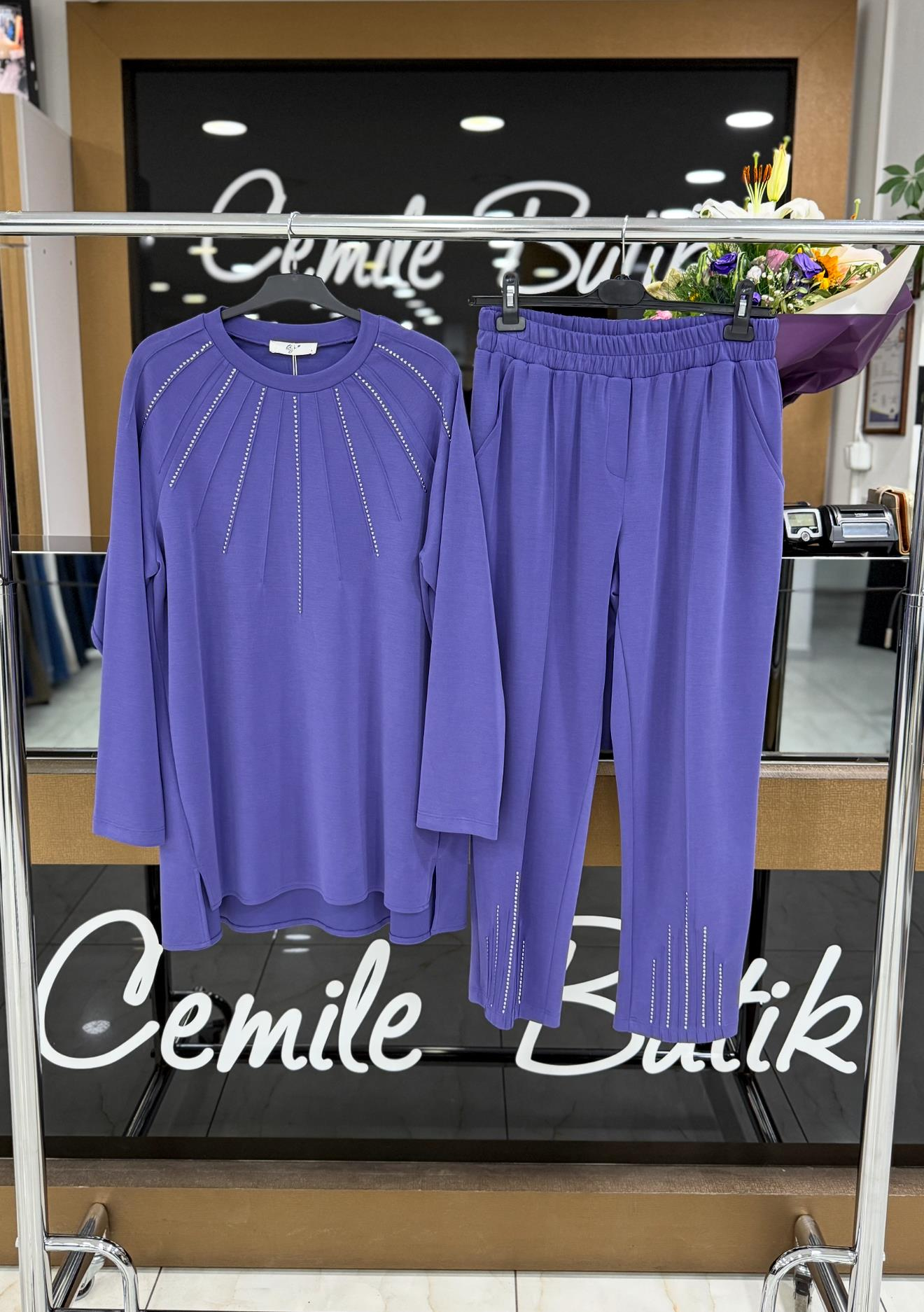 Nervürleri Metal Drop Süslemeli Takım Mor