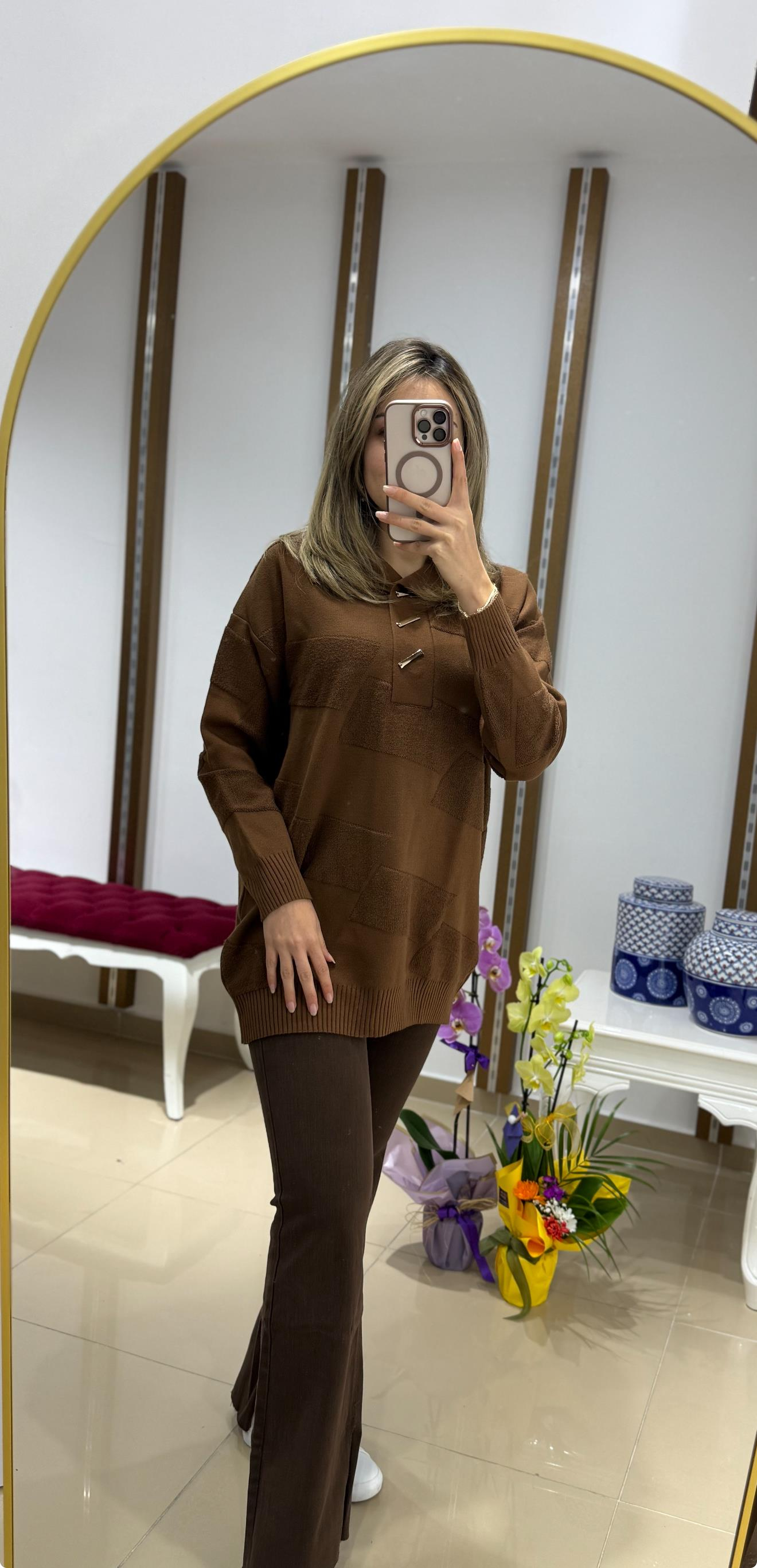 Polo yaka Kabartma Örgülü Triko KAHVE